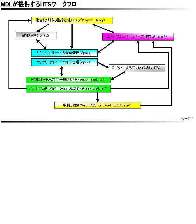 HTSでは、数万から数10万単位の化合物がマイクロプレート上に凍結されて濃縮保管されており、実際に使用する際にはこのマザープレートからサンプルを解凍・希釈してドータープレートをつくり、さらにそれらを組み替えてスクリーニング実験用のアッセイプレートを作成するといった手順をとる。このため、アッセイ実験の結果、活性があった化合物がどのマザープレートのどこに保管されているのか、さらには活性のあった化合物の情報をもとに新しいアッセイプレートのパターンでスクリーニングをやり直そうなどとすると、たいへん繁雑な手作業が発生するという問題があった。