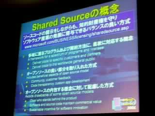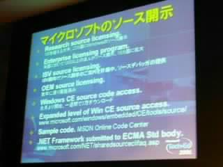これは、“シェアードソース”という考え方にのっとって行われており、「オープンソースの良いところを取り入れつつ、オープンソースに内包する危険性を回避し、互いに権利を尊重し合うための考え方が盛り込まれている」と説明、今後ともウィンドウズからドットネット、CEまで幅広く推進していくと約束した。古川副社長によると、現時点で7種類のソースコードを開示しているということだ。そのうちのいくつかはMSDNコードセンターからアクセスできる。