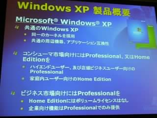 同社ではWindows XPをブロードバンド時代のウィンドウズと位置づけており、Windows2000をベースにした完全32ビットのエンジンを備えている。新しいユーザーインターフェースと映像や音楽を楽しむための基本機能を搭載した「ホームエディション」に対し、「プロフェッショナル」は強固なセキュリティ、強力なモバイル機能、ネットワークとの連動など、企業ユースでのさまざまな機能を盛り込んでいる。