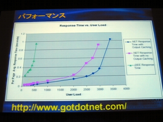 記者会見の後に開催された「ドットネット・デベロッパーズコンファレンス」では、IBMやサン・マイクロシステムズ、オラクルなどの他社が提示しているウェブサービス体系との比較が取り上げられ、阿多親市社長は「マイクロソフトはウェブサービスを構成する全部の要素を提供できるだけでなく、開発環境も優れている。ウェブサービス化を果たすために、ドットネット・フレームワークなら1行を加えればすむところが、Javaで書くと72行もかかる。また、複数の開発言語をサポートでき、とくに稼働中の業務ソフトの70%を占めるといわれるCOBOLを利用することが可能。COBOLのエンジニアは300万人もいる。さらに、携帯端末からパソコンまで、同じプログラミングモデル、同じ開発環境が利用できるのもドットネットだけだ」と述べた。次いで、パフォーマンスのスケーラビリティの高さを示した。サン自身のベンチマークコードを使って、Javaを大幅に上回る性能を叩き出したという。多数のユーザーをサポートできるスケーラビリティの高さが証明されたとした。
