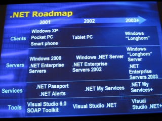 マイクロソフトの青写真としては、来年早々に正式なSDKを提供し、年央にはVisualStudio .NET(ビジュアルスタジオ・ドットネット)を使った開発に着手してもらい、インターネット上でのテストを経て、2003年からは本格的なサービスが開始されることを目指している。