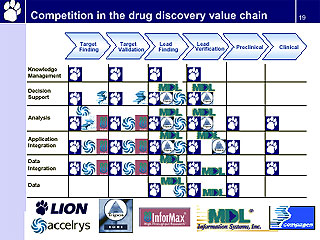 この点で重要なのがネットジェニクスの買収。これは1996年設立で60名ほどの従業員を抱える小企業だが、複数の異なるデータベースを仮想的に統合するIBMのミドルウエア製品であるDiscoveryLink(ディスカバリーリンク)の心臓部に当たるデータ変換技術“ラッパー”を開発した実績がある。ネットジェニクス自体の製品は、ディスカバリーリンクの上位に存在して異なるアプリケーションを統合化させる「DiscoceryCenter」(ディスカバリーセンター)と呼ばれ、ライオンはこれを創薬ターゲットの探索からリード化合物の開発、さらには前臨床、臨床までをカバーするアプリケーション統合技術の核として採用する計画である。