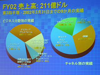 2002会計年度(2001年7月−2002年6月期)の第3・四半期までの9ヵ月間の実績では、「デスクトッププラットホーム分野の売り上げは69億ドルで前年同期比14%増。これはWindowsXPの成功が大きい。発売から2ヵ月間で1,700万本の販売を達成しており、当社の歴史のなかで最も成功したOSになったと言ってもいいだろう。企業向けのソフトおよびサービスは38億ドルで同6%増だ。伸びが小さく見えるが競合他社はこの分野で2ケタの落ち込みとなっている。SQLサーバーはすでに10億ドルのビジネスに成長しており、成長率はオラクルの2倍である。グループウエアのエクスチェンジサーバーも1億本のライセンスを出荷しており、すでにロータスの2倍だ。次に、コンシューマー市場は30億ドルで同82%増だ。ここにはXboxやMSN(マイクロソフトネットワークサービス)が含まれる。とくにMSNは継続的に粘り強く続けてきたおかげで加入者数が800万人に到達した。広告収入も33%増えている」と説明。地域別ではアジア市場がマイナス成長(7%減)となっているが、「これは為替レートの変動が要因であり、仮に円/ドルレートが一定だっからプラス成長だったと思う」とした。(写真:FY02売上高 211億ドルを参照)