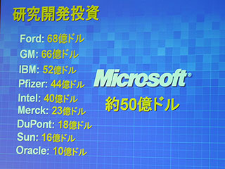 一方、コナーズCFOはこれらの強力な製品群を支える研究開発投資の現状についても言及した。それによると、マイクロソフトは年間約50億ドルを研究開発に投資しており、そのうち数10億ドルがデスクトップやサーバー製品の開発に、約10億ドルがMSN関係に、数億ドルがXboxをはじめとするエンターテインメント分野に、さらに数億ドルがアドバンスドリサーチグループに費やされている。このグループは将来のコンピューティングモデルを研究しており、音声認識技術などを研究テーマにしているという。コナーズCFOが示した資料(写真:研究開発投資)によると、同社の投資額はIBMとほぼ同額であり、R&Dに巨額の予算を計上するといわれるファイザーやメルクなどの大手製薬会社をも上回る規模に達している。