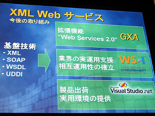 「われわれは1999年にウェブサービス革命を主張したが、当時はドットコムバブルがはじけた直後でほとんど注目されなかった。ところが、2000年になってIBMが追随し、いまやウェブサービスにコミットしていないベンダーを探すのは難しいほど。XMLウェブサービスへの流れはもはや確実であり、開発者のみなさんも安心してこの流れに乗っていただいてかまわない」とした。業界120社が加盟している推進団体「WS-I」の調査として、90%の開発者が2003年までにウェブサービスを構築する計画を持っており、またすでに開発経験のある人の97%がそれによって新しいビジネス機会をつかんだという情報を紹介した。