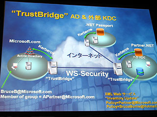 「また、今年の4月にIBMやベリサインと共同でウェブサービスの新たなセキュリティ技術を開発した。プラットホームや言語から独立した基盤技術で、マイクロソフトが独自に実装したものを“トラストブリッジ”と呼んでいる。トラストブリッジはネットワークの境界に配置され、認証と承認を通して組織を超えたセキュリティの共有を可能とする。ケルベロスなどのセキュリティフォーマットを利用して、アクティブディレクトリーやドットネットパスポートにセキュアにアクセスできる。これにより、互いの信頼関係が接続され、相互の協調が可能になる」と解説した。