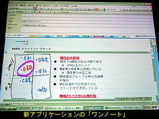 新アプリケーションの「ワンノート」は、手書きに対応している点でタブレットPCのジャーナルに似ているが、ジャーナルが1枚の紙のイメージなのに対し、ワンノートは実際のノートブックのメタファーで、ファイルという概念が存在しない点で異なっているという。