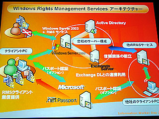 Windows Server 2003(ウィンドウズサーバー2003)にRMSサービス機能を組み込んで利用することができ、アクティブディレクトリーと連動してユーザーの権限を管理する。ファイルの暗号化やデジタル署名などにも対応している。通常は、社内のネットワーク環境で使用する機能だが、RMSホスティングサービスをマイクロソフトに依頼すれば、ドットネットパスポート(.NET Passport)の個人認証機能を利用することで、社外の人と情報共有することも可能。恒常的に外部企業と連携したい場合は、互いのウィンドウズサーバー2003のRMSサービス同士を接続することもできるようだ。