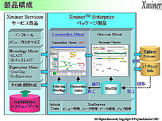 Xminerは、遺伝子やたん白質、酵素などの関連する情報を結び合わせた“コネクションインデックス”と、遺伝子間に存在するネットワークを浮かび上がらせ、それをわかりやすく視覚化するグラフィックツール“コネクションマイナー”から構成される。今回発売したのは簡易版の「Xminer-Lite」で、機能強化したマイニング機能に加えて遺伝子配列の表示ツール“ゲノムマイナー”をセットにした「Xminer-Personal」(Windows版)、企業全体のバイオ研究インフラに発展させることを可能にした「Xminer-Enterprise」(Solaris版)を今年の夏に製品化する。