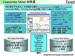 このコネクションインデックスを利用して、調べたい特定の遺伝子群の相互ネットワークを探索するのがコネクションマイナーの機能である。同社が特許出現中の技術を利用し、遺伝子間の関連性を抽出したり、それを見やすく再配置したりすることを可能にした。フィルタリング/マイニングのキーになるのは、GOCが規定した7種類のオントロジーで、具体的には遺伝子機能(Function)、文献情報(Reference)、発現組織(Phenotype)、細胞内局在性(Localization)、組織(Tissue)、たん白質ドメイン(Domain)、EC番号(EC-number)の7つ。この7種類の大項目とその中に含まれている階層的な用語を使って、視点を切り替えながら関連性の高い遺伝子群をグルーピングし、それぞれが具体的に何の情報でつながっているのかを瞬時に理解することができる。