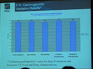 さて、バーフォド上級副社長は講演の最後でFDAとの共同プロジェクトについて説明した。過去2年間にわたって実施してきたもので、新たに5年間の延長契約が結ばれたばかりのものだという。目標は、新薬開発の研究者や当局の審査員が利用できる毒性学的エンドポイントのインシリコ予測手法を開発すること。まずは、発がん性に的を絞って開発が行われた。約1,300化合物のトレーニングセットを用いて予測式がモデル化されており、FDAが実際の約100種類の化合物の発がん性試験で予測モデルのバリデーションを行ったところ、「リスクの高い化合物で91%の感度、リスクの低い化合物で94%の特異度の結果を出した」という。(写真参照)