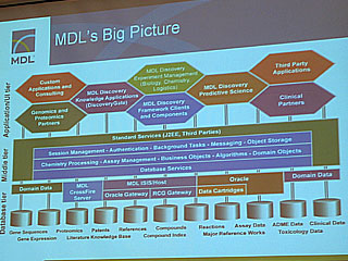 その後、バーフォド上級副社長は、開発コストの増大が問題になっているなどの新薬開発をめぐる情勢を概括してからMDLの製品紹介に話しを移し、まずは「アイセントリス」を取り上げた。これは、ウェブベースの三層アーキテクチャーに基づいたアプリケーションフレームワークで、「創薬研究分野に特有の機能をあらかじめ備えた唯一の開発者用フレームワークである」と位置づけられる。3階層モデルのうち、データベース層はオラクルやISIS、クロスファイアーなどを介して多数のDBコンテンツ群を蓄積・管理することができる。ミドル層は、IBMのWebSphere(ウェブスフィア)やBEAのWebLogic(ウェブロジック)、オラクルのOracle9iASのような標準的なJ2EE対応のアプリケーションサーバーが利用可能。そこにMDLのアプリケーション群とのインターフェースをビルトインされた形の構成となる。