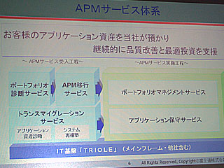 今回のAPMサービスは、そうした問題解決を図るとともに、新規開発に比べて堅調な保守分野でビジネス拡大を見込む富士通の新戦略だと位置づけられる。APM体系は、保守関連業務を幅広く網羅したもので、実際の保守に入る前の「ポートフォリオ診断サービス」と「APM移行サービス」、「トランスマイグレーションサービス」、実際に保守を実施するに当たっての「ポートフォリオマネジメントサービス」と「アプリケーション保守サービス」−から構成されている。