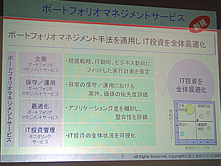 とくに、経営戦略に基づいてIT戦略を企画・提案することと、経営戦略に基づいてIT投資の全体最適化を図ることをメインターゲットしていることが特徴となっている。具体的には、アプリケーションの保守に際してポートフォリオマネジメントの考え方を導入し、経営戦略やIT動向、ビジネス動向に則した実行計画を策定したり、日常の保守/運用における案件や価値の優先度を評価したり、アプリケーション資産を棚卸しし、整合性を評価したりすることを可能とする。戦略的インパクトと技術的インパクトを評価軸とし、「積極取り組み」、「横展開検討」、「方策再検討」、「見送り」−といった4つの領域にマッピングすることで、IT投資の全体最適を実現していく。