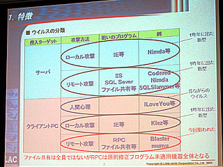 今回のブラスターワームは、このMS03-026のぜい弱性を悪用したもの。最近のウイルス攻撃はコードレッドやニムダなどサーバーのぜい弱性を突いて侵入するものが多く、いわば不正侵入のためのクラッキングの手口を自動化したタイプが広がっている。今回のブラスターは、その手口でクライアントパソコンを遠隔攻撃する点で新しいタイプの脅威だといえるという。