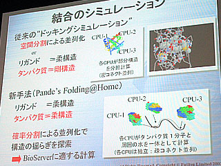 一般的なMD計算では、たん白質を周期境界条件で区切って“空間分割”によって並列化を行うことが多いが、この手法ではCPU間通信がボトルネックとなり、並列度をあまり上げられないという問題があった。しかし、今回の“確率分割”では、各CPUに薬物分子とたん白質とのクラスター構造を与え、周囲の水分子の状態などの計算条件を変えたシミュレーションを並列で実行させる。計算結果をフロントエンドマシンに一旦集めて評価し、溶媒中でのたん白質構造の揺らぎを探索していくという手法である(写真参照)。このため、バイオサーバーの各CPUは独立した計算を行っており、通信のボトルネックは発生しない。また、CPU数が増えるほどに直線的に性能が向上することになる。
