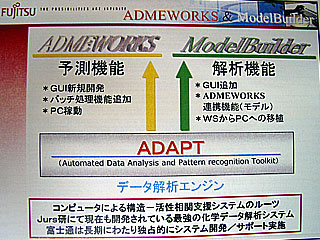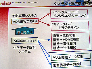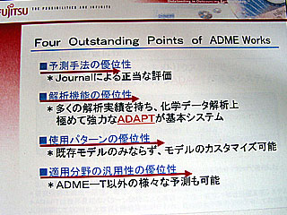 2004.01.08−富士通と富士通九州システムエンジニアリング(FQS)は、国産で初めてのADME(吸収・分布・代謝・排出)/毒性予測システムを開発、「ADMEWORKS」(アドメワークス)の名称で販売を開始した。医薬候補化合物の分子構造から薬理活性や薬物動態、毒性の有無などをコンピューター上で判定してバーチャルスクリーニングに役立てることが可能。ユーザー自身が手持ちのデータセットを使って予測モデルを数学的に作成することもできる。いろいろなモデルで常に90%以上の予測精度を達成しており、初の国産ソフトとして大きな反響が期待される。