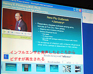 MAVSは音声の中からキーワードを自動的に抽出してインデックス化する機能があるため、これまでは不可能だった「ビデオコンテンツの検索」が可能になる。デモンストレーションでは、「インフルエンザ」というキーワードを入力すると、「インフルエンザ」という語が発音されたコンテンツ一覧を取得し、しかもそのコンテンツで講演者が「インフルエンザ」と発言した部分からビデオを再生できることが示された。今年の夏ごろには、ライフサイエンスチャンネルの中でMAVS検索が行えるようになるという。