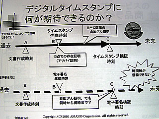 パソコンに内蔵されている時計は自由に時間を変えられるため、単純なファイルの作成日時だけでは法的な証拠能力は得られない。このため、時刻認証と電子署名を組み合わせることが完全な保護につながる。実際、昨年7月から採用している官報でもこの形式をとっているという。