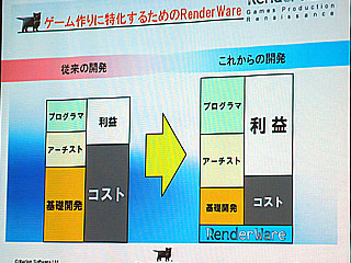 さて、今回の「RenderWareスタジオ」は同社初のソリューション製品で、グラフィックエンジンの「RenderWareグラフィックス」、物体の物理的挙動を描き出す物理シミュレーター「RenderWareフィジックス」、ゲームキャラクターにインテリジェントを持たせるAI(人工知能)エンジン「RenderWare A.I」、5.1チャンネル対応のサウンド開発ツール「RenderWareオーディオ」−といった各種開発環境だけでなく、プロジェクト管理や資産管理などの機能も包含し、企画からプロトタイプ制作、プログラミング、アートワーク、サウンド開発、マスターアップまでのゲーム制作工程全体をトータルに効率化できる。