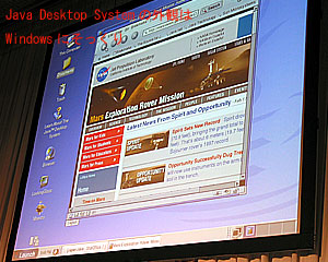 次いで、パソコン分野に話しを移し、同社が提供している「Javaデスクトップシステム」を紹介した。これはLinuxベースのデスクトップ環境で、Windowsとそっくりの概観を備えている。「STARTボタンが“Launch”に、My Computerが“This Computer”になっているだけ」(シュワルツ副社長)だという。統合オフィスソフトの「スタースイート」がバンドルされており、Windowsとの高い互換性を持っている。昨年12月からユーザー1人当たりの年間使用料100ドルで提供を開始したが、すでに11万人がこのデスクトップシステムを利用しているとした。