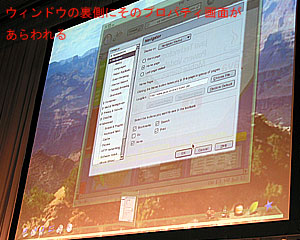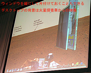 シュワルツ副社長は、「ただ、外観がWindowsに似ていることが面白くない」と茶目っけたっぷりに述べ、開発中の“プロジェクト・ルッキンググラス”を紹介、デモンストレーションを行った。これは、三次元化されたデスクトップで、どちらかというとMacOS Xに似ている。ウィンドウは映像などを表示させたまま三次元的に回転させることが可能で、複数のウィンドウを縦にして邪魔にならないように片付けておくこともできる。ウィンドウを裏返すと、そのウィンドウのプロパティ画面がくっついていたりする。まだまだ開発中の段階だというが、「デスクトップ環境からマイクロソフトを一掃したい」と冗談混じりながらも、最終目標をはっきりと示した。