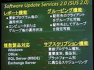 次に紹介されたのは「ソフトウエアアップデートサービス」(SUS2.0)で、WindowsXPサービスパック2(SP2)と同時に無償でリリースされる予定。現在はSUS1.0を無償ダウンロードできる(http://www.microsoft.com/japan/windowsserversystem/sus/default.mspx)。これは、パッチをあらかじめまとめて取得しておいて、管理者が社内のPCに自由なスケジュールで自動展開できるようにするツールである。サブスクリプション機能により、複数の製品の多数のパッチを効率的に管理できるという特徴がある。
