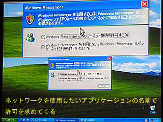 WindowsXPには、すでにファイアーウォール機能が装備されているが、デフォルトではオフになっている。しかし、今年上半期中に提供予定のSP2では、ウィンドウズファイアーウォールに名前が変わって機能が強化され、デフォルトでオンとなる。古川氏は「ほとんどのアプリケーションは特定のポートが開いていることを前提に書かれており、ファイアーウォールを適用するとネットワークアプリケーションの互換性の問題が生じてしまう。安全な通信にはその都度ポートを開いてやればいいわけだが、これまでは専門用語での難しい設定が必要で、初心者が操作することは困難だった。ところが、ウィンドウズファイアーウォールではアプリケーションの名前で許可を求めてくるので誰にでもわかりやすい。また、そのアプリケーションが終了すると、自動的にポートが閉じるようになっている」と解説する。
