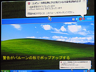 一方、「セキュリティセンター」はWindowsXPのタスクバーに常駐するツールで、ウィンドウズアップデート(またはマイクロソフトアップデート)の自動更新がオフになっていたり、ウイルス対策ソフトのリアルタイム監視機能がオフになっていたりすると、バルーンで警告をポップアップし、利用者に注意を促す役割を果たす。企業内でドメインに参加している時は、管理者が定めたセキュリティポリシーに連動して設定を監視してくれる。
