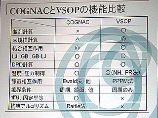 実際には、VSOPはCOGNACコードを直接並列化したものではなく、日本総研が日本原子力研究所・計算科学技術推進センターと共同開発した分子動力学シミュレーションのためのサブルーチン集「並列分子動力学ステンシルPMDS」を利用し、COGNACの機能を実装したプログラムとなっている。このため、COGNAC本体と比べると、温度・圧力制御がNH/PR法に限定されたり、静電相互作用解析がPPPM法だけだったり、利用できる境界条件が周期境界条件に限られたり、COGNAC特有のずりや固定壁を設定したシミュレーションができなかったりするなどの制限事項がある。また、OCTA専用のUDFファイル形式をサポートしないので、コンバーターを使って入力ファイルを作成することになる。このため、VSOPとCOGNACは相互補完的に使い分けるのが良いようだ。