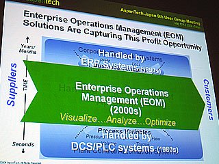 EOMは、プラント/プロセスのシミュレーションモデルを中核にしてオペレーション領域のシステム統合化を実現するコンセプトで、各種のプロセスエンジニアリング/シミュレーションツール、高度制御/オンライン最適化ツール、SCM(サプライチェーンマネジメント)などの多くの製品群から構成されている。同社ではこれを、石油精製・化学・製薬・オイル&ガスなどの業界別ソリューションとして体系付けている。