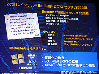 モンテシートは、今回ウエハーが初めて披露された。17億個のトランジスターを集積し、3倍以上のプラットホーム帯域幅を持つデュアルコアチップとなる。キャッシュも24MBと大幅に増える。仮想化のためのシルバーベール技術を導入し、デマンドベーススイッチングで電力管理を行う。さらに次世代のタクウィラになると、複数個のコアおよびキャッシュを実装し、ジーオンの2倍以上の性能を狙っていくということだ。とくに、2005年以降、デュアルコアの登場とともに価格性能比が大幅に向上すると期待される。