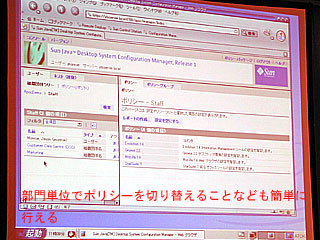 ただ、Windowsに似せた外観をまとったLinuxはもはやめずらしくはない。むしろ、Sun Java Desktop Systemの最大の特徴は、企業のシステム管理者を助ける一元管理ツールが標準装備されていることだ。各デスクトップの資産管理やOSを含むソフトウエアのバージョンを管理し、最新バージョンを全デスクトップに一括配布する機能を持つ「サン・コントロールステーション」、ポリシーベースによる各デスクトップの構成管理を実現する「Javaデスクトップシステム・コンフィグレーションマネジャー」、リモートデスクトップの画面を管理者のデスクトップ上に呼び出し、遠隔から画面操作などを行う「リモートデスクトップ・テイクオーバー」−を標準で搭載した。
