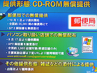 提供形態はオンラインとオフラインがあり、オンラインではウィンドウズアップデートおよびダウンロードセンターを利用して、2日の午前0時から開始している。ダウンロードサイズは、XPプロフェッショナル版で最低100メガバイト、XPホーム版で同80メガバイト。これまで一度もウィンドウズアップデートしていない場合は最大で270メガバイトとなる。また、企業ユーザー向けの自動更新機能による適用では、評価期間を考慮して29日からの提供とする。さらにしばらく様子をみたいユーザーのために、自動更新させないためのツールも用意しているという。