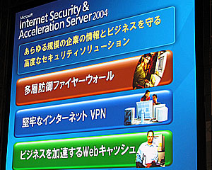 さて、講演の後半ではInternet Security & Acceleration サーバー2004(ISAサーバー2004)が紹介された。これは、ファイアーウォールやVPN(バーチャルプライベートネットワーク)の堅牢なセキュリティ設定を実現するための管理ソフトで、年内に提供される模様。