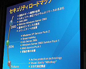 とくに、セキュリティパッチの更新作業の簡素化を図り、マイクロソフト全製品をカバーした“マイクロソフトアップデート”の提供、システムマネジメントサーバーにアップデートサーバー機能を統合するなどのツール面の強化など、ユーザー企業のIT部門の負担を軽減したことを強調。また、社内の開発部隊に対してセキュリティトレーニングを徹底し、開発プロセスをセキュアにした成果として、例えば出荷開始後1年間のパッチ数がWindows2000サーバーが42個だったのに対し、Windowsサーバー2003は13個しかないこと、エクスチェンジ2000サーバーでも開発プロセス変更前は7個のパッチが出ていたが、変更後は23ヵ月間で1個のパッチしか出ていないこと、SQLサーバー2003でも同様に13個のパッチがあったのが、プロセス変更後は17ヵ月間で3個しか出ていないことを取り上げた。バルマー社長は「われわれはぜい弱性の数を削減することに成功している」と胸を張った。
