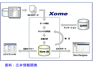 Xomeは、MS装置から出力されたMS、MS/MSスペクトルデータからピークを検出し、データベースに基づいてたん白質の同定、定量計算を行う統合システム。解析エンジンとしてMascot(マトリックスサイエンス社)やオープンソースプログラムを使用することもでき、複数の結果をサマライズすることが可能。公共データベースを参照して、自動的にアノテーションを付ける機能も持っている。