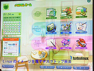 2004.10.23−ターボリナックスは、パソコン初心者を対象にした初の本格的な家庭向けLinuxディストリビューション「ターボリナックスホーム」(商品名)を開発、11月12日から販売を開始する。大きなアイコンを使った専用のデスクトップ画面を備えており、インターネット、メール、デジカメ写真編集、はがき作成というホームユーザーの主な用途すべてをカバーできるアプリケーションをバンドル。パソコンに不慣れな初心者がそのまま簡単に使えるように工夫した。価格は1万6,590円で、年間3万本の販売を見込んでいる。