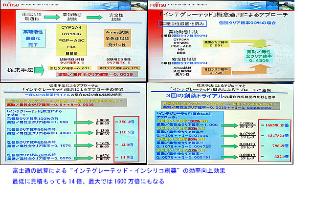 富士通が提案する“インテグレーテッド・インシリコ創薬”は、薬理活性/ADME/毒性/物性といった複数の要求項目をシミュレーションによって同時的に評価し、クリアした候補だけを実際に合成して試験にまわすという考え方。シミュレーションが100%当たるとすると、3回のフィードバックが生じた場合の逐次的アプローチに比べて、単純計算で1,600万倍の効率向上になるという。シミュレーション精度が70%としても、効率は3,000倍も向上すると試算している。