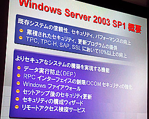 具体的にセキュリティを強化する新機能として、データ実行防止(DEP)、RPCインターフェースの制限、DCOMセキュリティの強化、Windowsファイアーウォール、セットアップ後のセキュリティ更新、セキュリティの構成ウィザード、リモートアクセス検疫サービス−があり、最初の3つはSP1を導入すると自動的に有効とされる。あとの4つは管理者の選択によってSP1適用後に有効にすることができる。