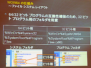 32ビットアプリケーションはOS上のエミュレーションレイヤーである“Windows32 on Windows64”(WOW64)を介して動作する。このサブシステムは、プロセスの起動時ではなく、OSの起動時に自動的にロードされる。具体的には、32ビットアプリケーションからシステムコールが発せられると、WOW64がそれをインターセプトして、64ビットシステムファイルを利用できるようにする。32ビット環境と64ビット環境をうまく混在させるため、レジストリーやファイルシステムをリダイレクトする仕組みが組み込まれている。