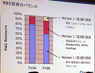 「これからはできるだけロードマップを明確にし、定期的な開発・リリースを行っていく。そのために研究開発投資のバランスも見直した。これまでは、80%以上が既存製品のフォローに占められており、新製品開発に向けての投資は20%以下だったが、今後は既存製品向けを65%、新製品開発で25%、新しい計算理論などの研究投資に10%といった比率に変えていく(写真参照)。パートナー製品や競合製品をも統合できるプラットホーム技術の強化がポイントになる」