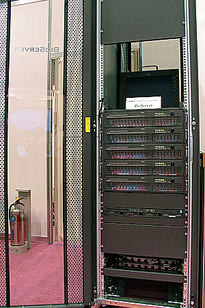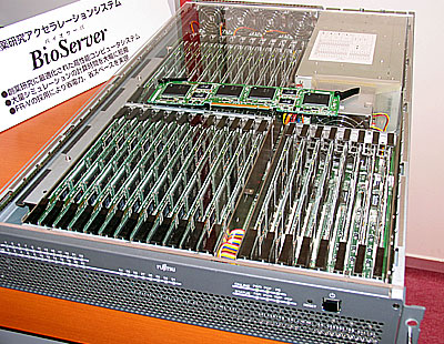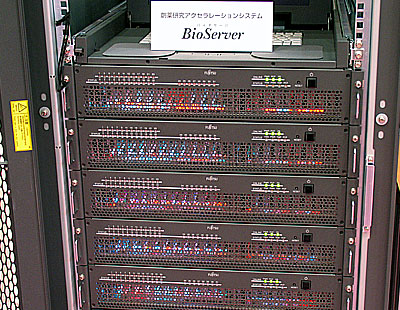 富士通フォーラム2005で公開されたバイオサーバーの実機。これは5台のボックスをラックマウントした640プロセッサーの構成。