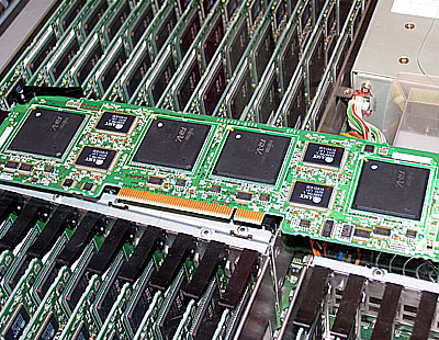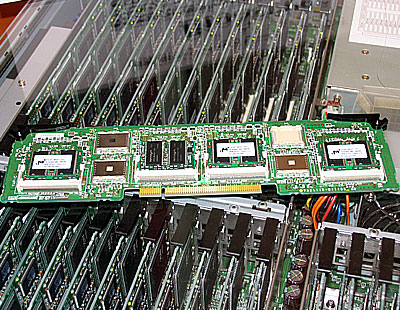 ラックマウントモジュールの内部。32枚のプロセッサーボードが実装されている。ディスクなどは入っていない。非常にシンプルな構造。
