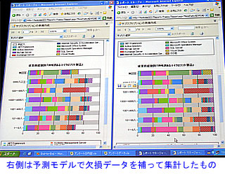 SQLサーバー2005インテグレーションサービスとビジュアルスタジオ2005を組み合わせて、エクセルからデータを抽出してSQLサーバーに移し、データ統合を行って、レポートに埋め込んで出力するというデモが行われた。また、アンケート集計では、記入項目に欠損のあるデータが多くなるが、過去のデータを用いて「こういうプロフィールの人はこの選択肢を選ぶ確率が高い」などの予測モデルを作成し、それに基づいてアンケートのデータの欠損を埋めて集計し直すというデモも目を引いた。傾向を正しくとらえたい時などに威力を発揮するようだ。