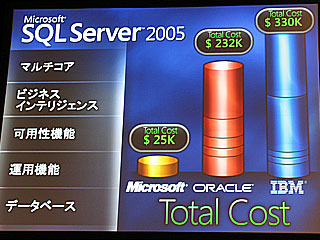それによると、SQLサーバー2005とOracle10g、DB2とを比べた時、データベースエンジンとしてのコアの価格はSQLサーバー2万5,000ドル、10gが4万ドル、DB2も2万5,000ドルと大差ないが、運用支援や高可用性、ビジネスインテリジェンス、マルチコアといった機能を追加したトータルコストでは、SQLサーバーが変わらず2万5,000ドルなのに対し、10gは23万2,000ドル、DB2は33万ドルに跳ね上がる。