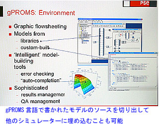 また、オープン性も大きな特徴で、“gPROMS言語”で書かれたモデルのソースコードが開示されている。簡単なプログラミングの知識があれば容易に理解することができるため、モデルがブラックボックスにならず、修正や改良も簡単に行える。このソースの中からモデルを取り出してオブジェクトとしてエクスポートし、他のシミュレーターに組み込むことも可能。集中定数系シミュレーターの中で分布定数系モデルが利用できることになる。