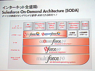 SODAでは、通常のOS(基本ソフト)が占める位置をMultiforceが、アプリケーション統合やデータ統合のプラットホームをSforceで置き換えるという構成になる(写真参照)。このため、業界標準に基づいて開発されたウェブサービスであれば、これらのプラットホーム上で簡単に動作させ、しかもサービス間でシームレスな連携を取らせることが可能。ユーザーインターフェースとして、パソコンのウェブブラウザーだけでなく、携帯電話やPDA、IP電話など、インターネットに接続できてウェブサービスに対応可能なあらゆるデバイスを柔軟に利用することができる。ユーザーはこれまでのようにソフトウエアを購入・インストールするのではなく、ウェブサービスとしてオンデマンドでアプリケーションを利用することになるというのが、ベニオフ会長の考え方だ。