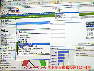 セミナーの中では、グーグルのマップサービスと連携させて、地図上に顧客の所在地をプロットさせたり、NTTコミュニケーションのオンデマンド型IPコンタクトセンターサービスと連携させて、電話によるサポート業務を行ったりするデモンストレーションが披露された。今回のMultiforceでは、画面右上にある「S」のマークのボックスをプルダウンさせることによって、利用可能なサービスのリストが表示されるため、利用者がそれを選ぶだけでそれぞれの業務に適した画面に切り替わるようになっている。