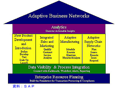 「SAPが今後提供していくエンタープライズソリューションの新コンセプトで、適応力と成長性に富んだ企業になるための総合的なIT構想を示したものだ。ERP(エンタープライズリソースプランニング)を基盤に、新製品の開発と市場導入、販売とマーケティング、生産、サプライチェーンネットワーク−の4つのビジネスプロセスをサポートする。プラットホーム技術としてのネットウィーバーを核にしており、SAPとしては最近はミドルウエア体系の整備に力を入れてきたが、今後はネットウィーバーの上でABNに対応したアプリケーションの提供を加速させていく」